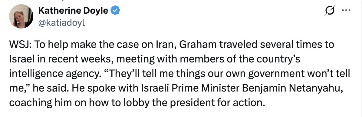 Senator Lindsey Graham was a key voice pushing Donald Trump to strike Iran, repeatedly lobbying the president and framing military action as historic leadership while using rhetorical appeals in private conversations. According to the Wall Street Journal, to strengthen his case, Graham traveled to Israel multiple times in recent weeks to meet with intelligence officials, saying they would “tell me things our own government won’t tell me,” and he spoke with Israeli Prime Minister Benjamin Netanyahu while advising him on how to lobby Trump directly for military action.