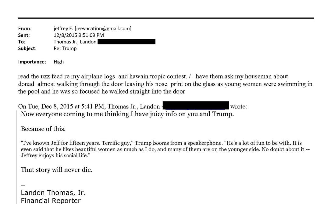 Jeffrey Epstein on Trump: “Have them ask my houseman about donald [Trump] almost walking through the door leaving his nose print on the glass as young women were swimming in the pool and he was so focused he walked straight into the door.”