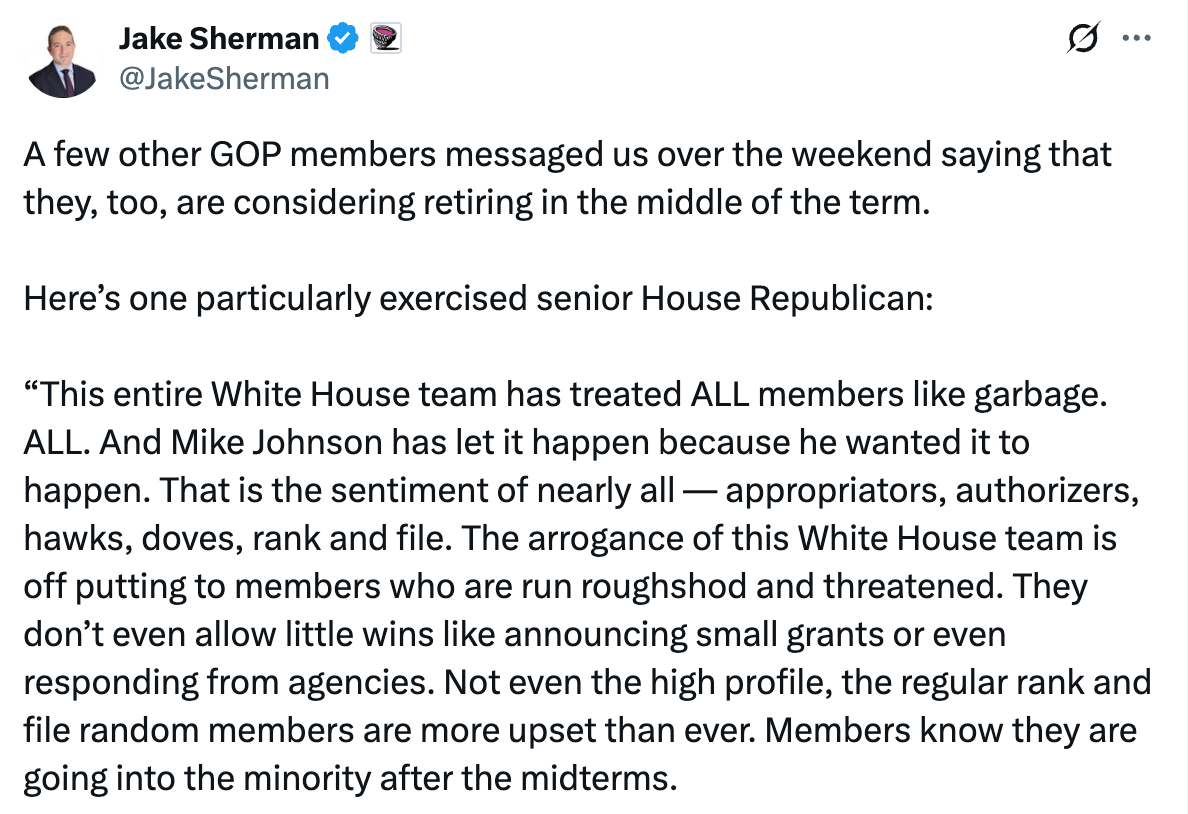 A senior House Republican warned that Marjorie Taylor Greene’s resignation may be the first of multiple impending GOP departures, citing deep frustration with the Trump White House, low morale, and fears the party could lose its majority before the midterms.