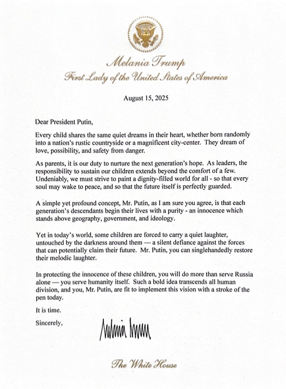 Melania Trump penned a letter to Vladimir Putin today urging him to end the conflict in Ukraine: