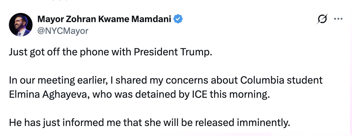 His team even drafted mock newspaper headlines to show how the project could be framed publicly, a move that reportedly left Trump very enthusiastic about the plan. During the discussion, Mamdani also pressed Trump on the detention of a Columbia student earlier that day, and Trump later called to say she would be released. Before leaving, Mamdani handed Susie Wiles a list of four additional students targeted over pro-Palestinian protests, asking for further intervention on their behalf. Here is an image posted to the Mayor’s social media accounts: