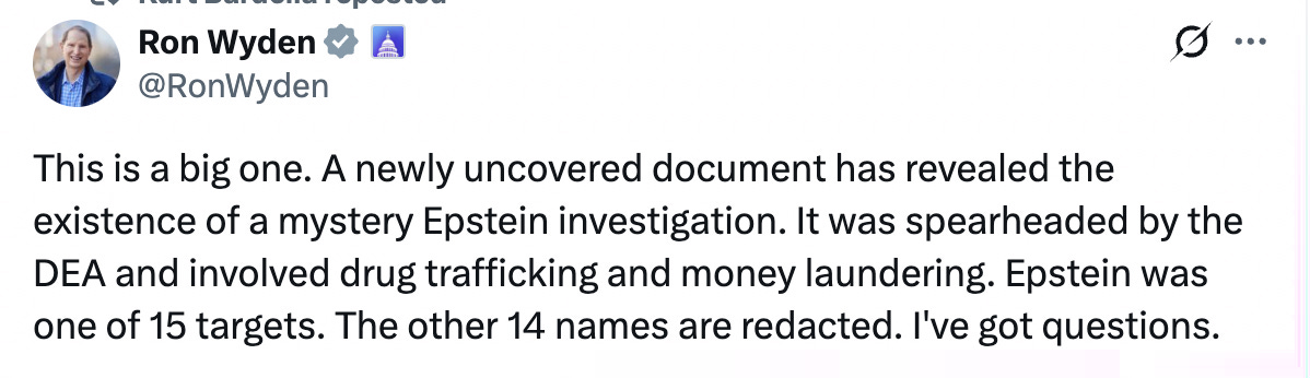According to Senator Wyden, he is demanding the DEA provide more information about a previously undisclosed investigation into Jeffrey Epstein and 14 alleged co-conspirators for possible drug trafficking and money laundering, after a heavily redacted 2015 DEA memo surfaced in recently released files. Wyden called the findings “incredibly disturbing,” questioned why no related charges were filed, and asked for an unredacted copy of the memo and details about how the long-running probe was handled.