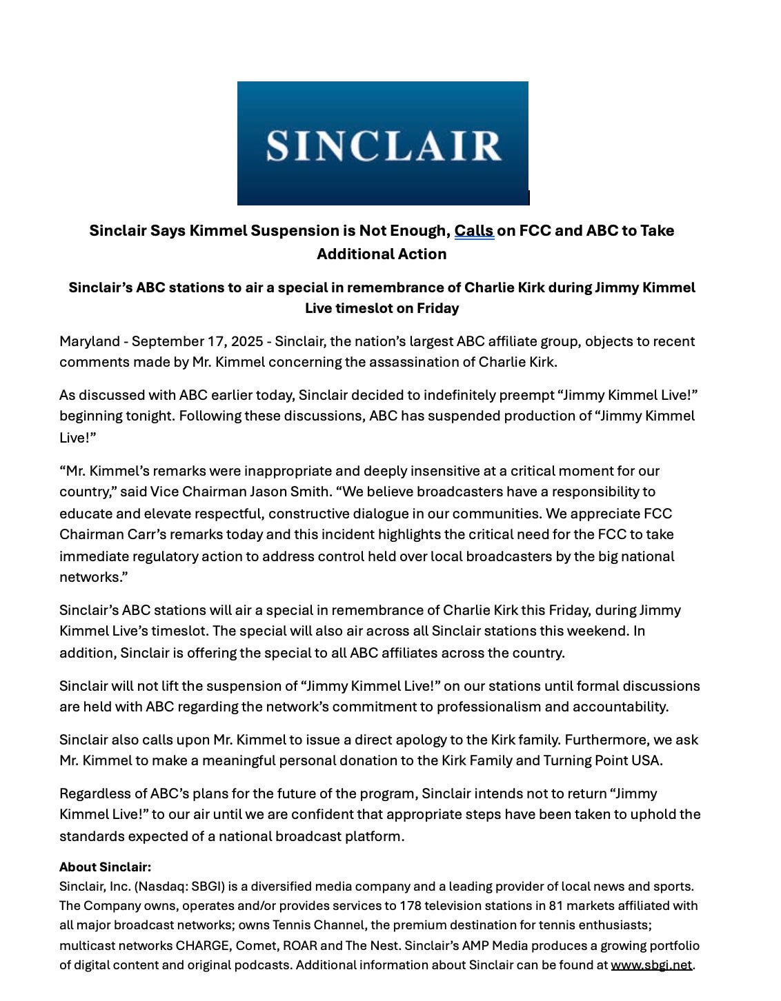 Sinclair demanded Jimmy Kimmel apologize to Charlie Kirk’s family and donate to them and Turning Point USA, while joining Nexstar in pulling Jimmy Kimmel Live! from ABC affiliates; FCC chair Brendan Carr and conservative allies praised the move, as Democrats accused Trump and broadcasters of coordinated censorship and authoritarianism.