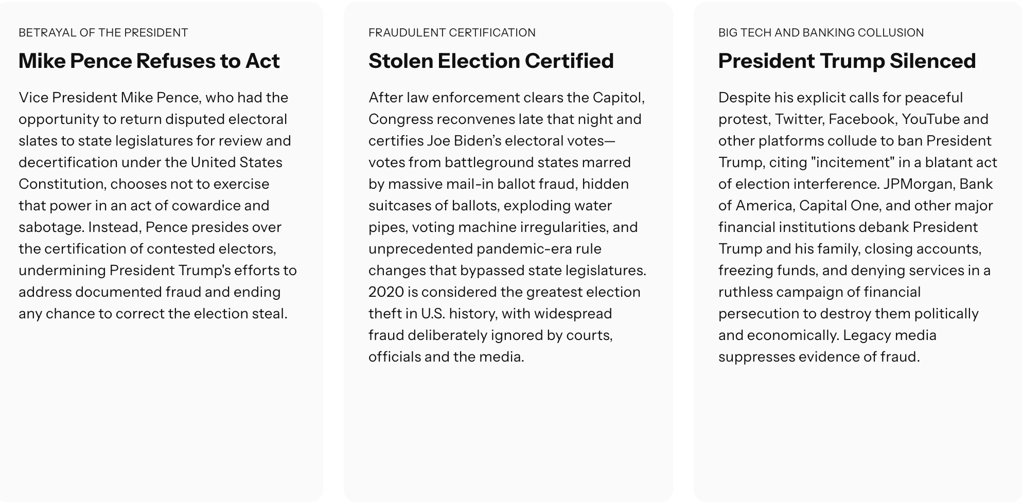 The website asserts that the election was “stolen,” despite repeated court rulings rejecting those claims, and echoes conspiracy theories alleging FBI entrapment and a so-called deep state plot behind the attack.