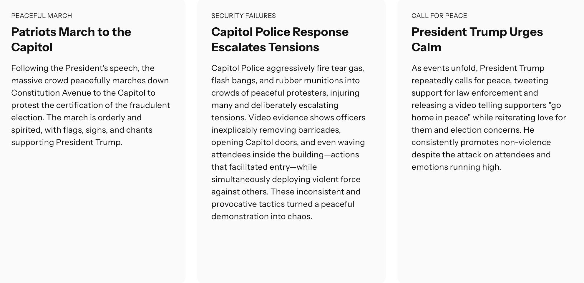 The White House website presents the President’s version of events on January 6, 2021. Its timeline opens by portraying those who marched to the United States Capitol as “patriots,” falsely characterizing the march as peaceful. It describes the crowd as “orderly and spirited,” highlighting flags, signs, and chants in support of President Trump while omitting the violence that unfolded.