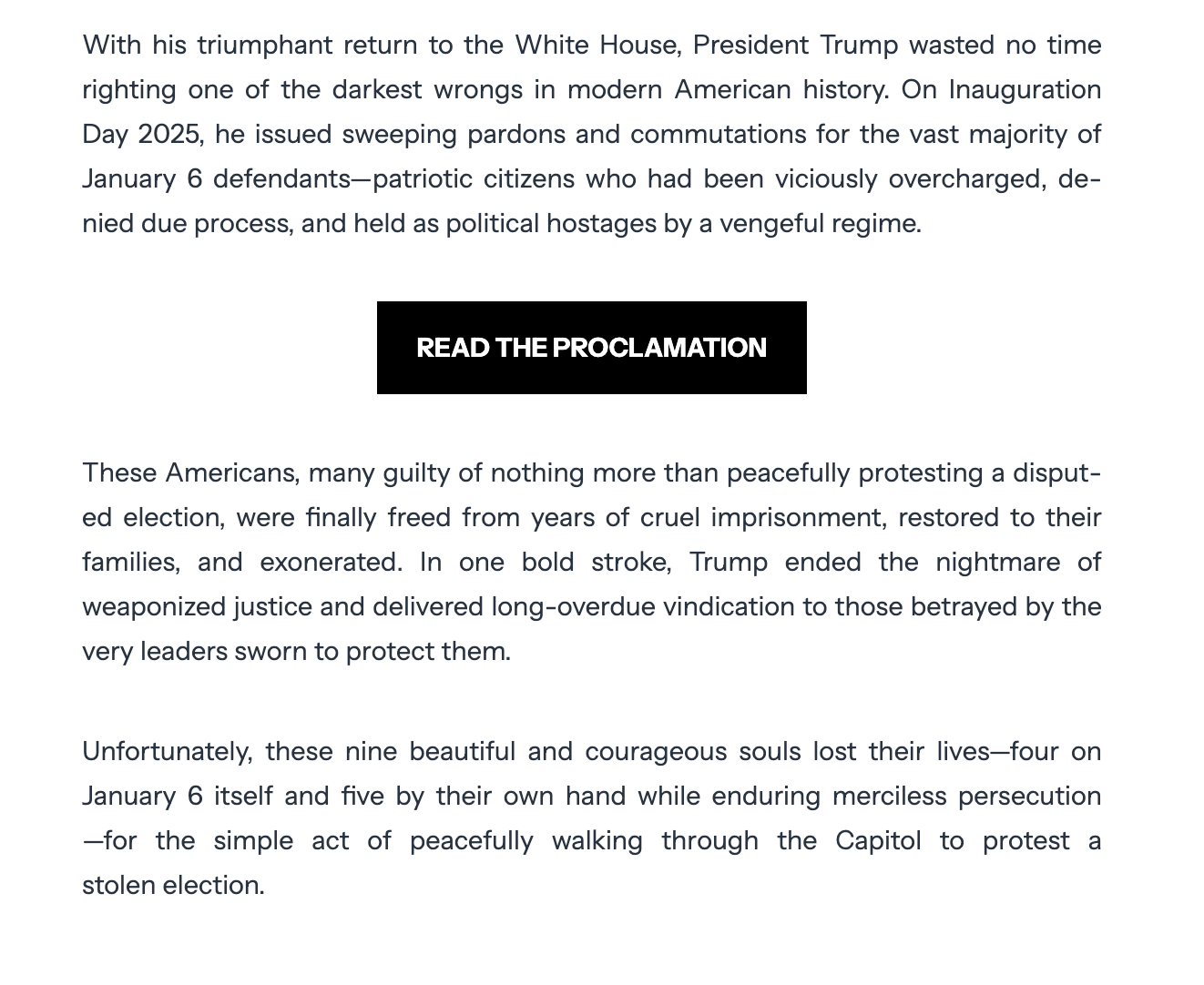 The White House also falsely asserts that those who died in connection with January 6 were innocent victims of persecution for peacefully protesting a “stolen” election. Multiple investigations, court rulings, and official reports have established that the election was not stolen and that the Capitol was violently attacked. These claims distort documented facts, erase the violence inflicted on law enforcement, and attempt to reframe a criminal attack on democratic institutions as an act of heroism.